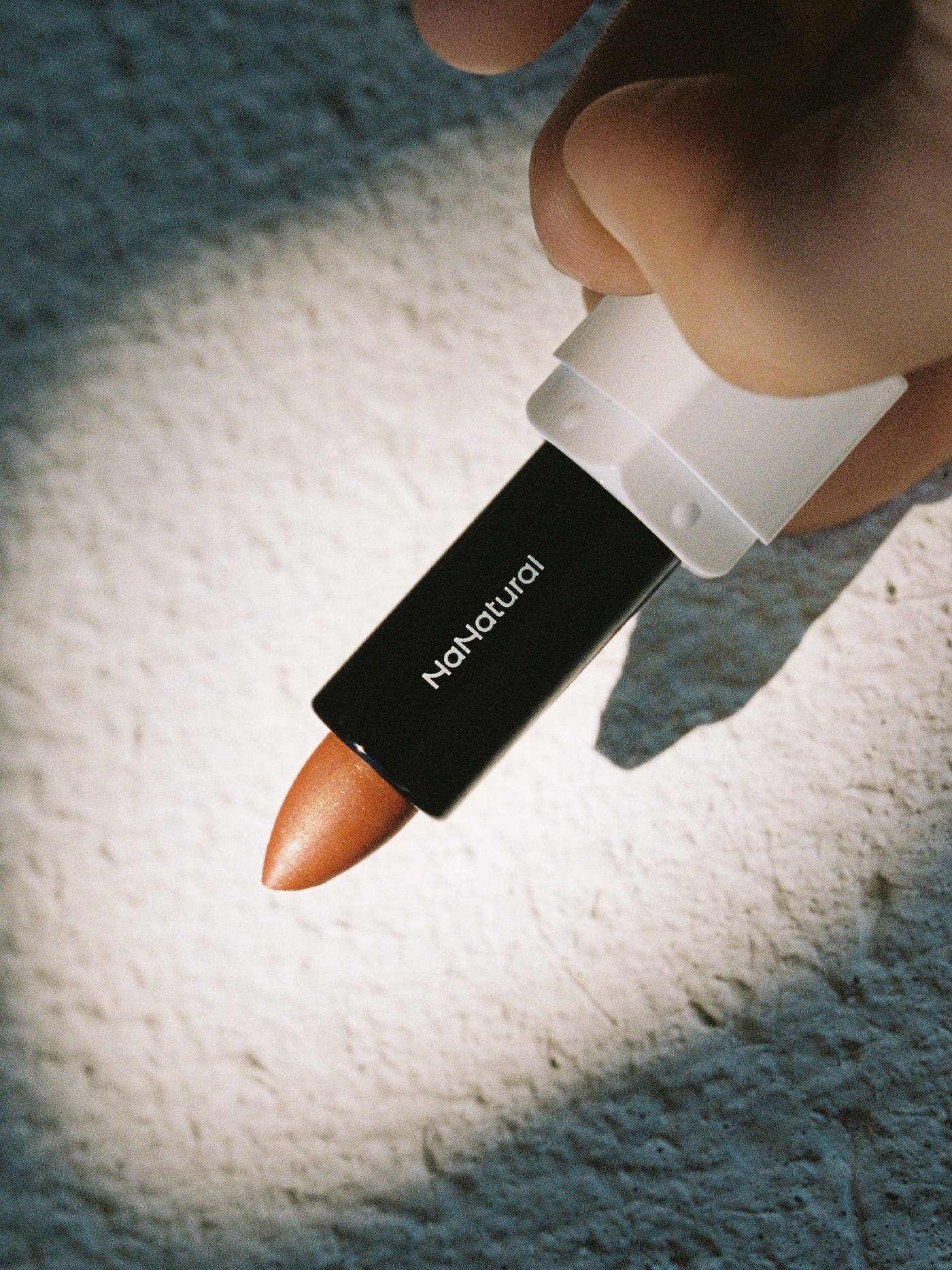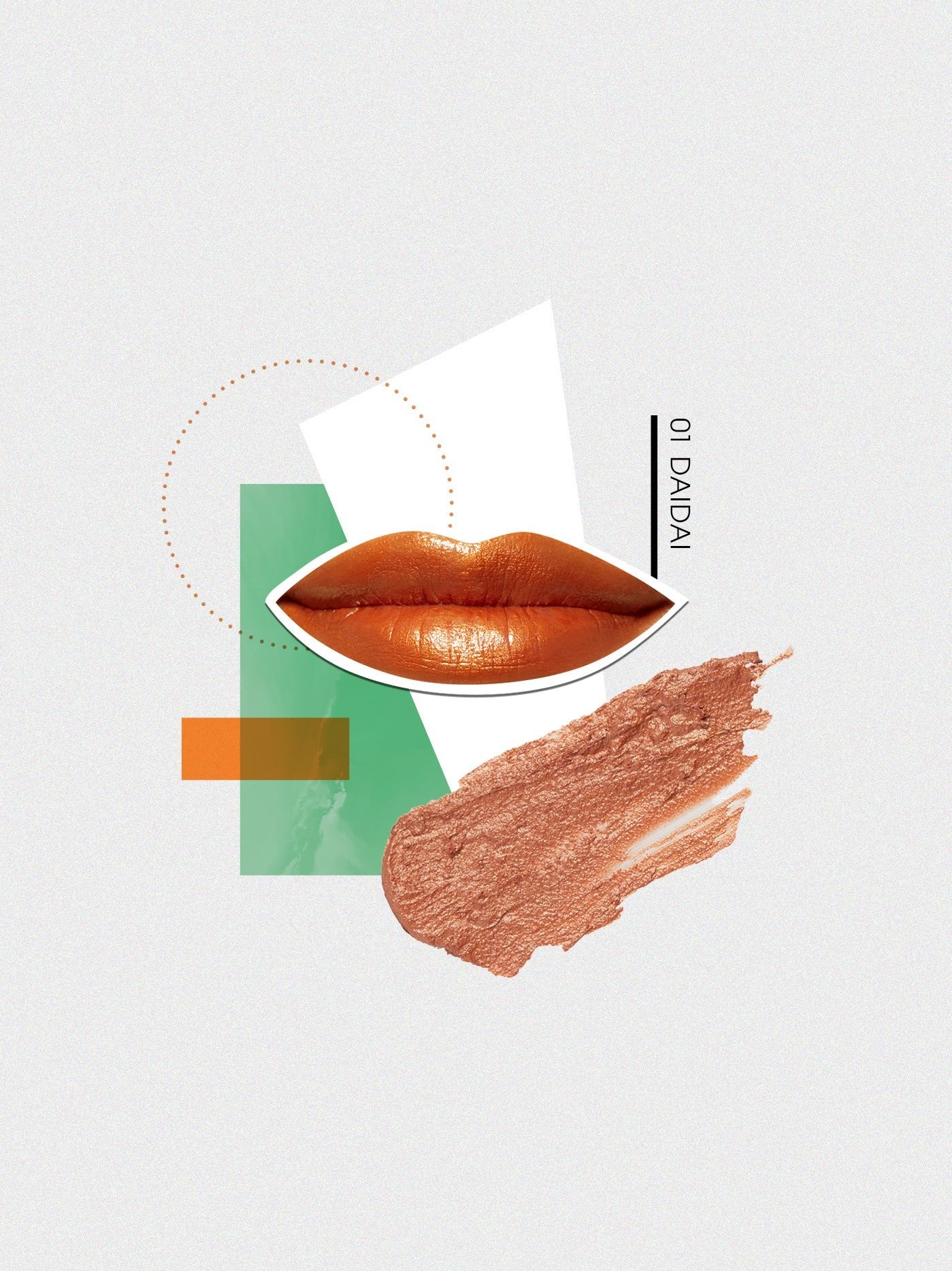 ゴールドのメタリックパールがさりげなく輝き、自然なツヤと血色を演出するダイダイ色。唇にも目元にも。